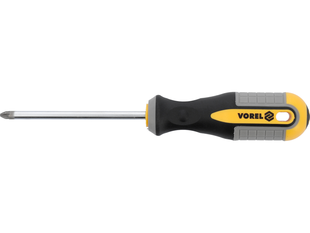 Șurubelniță PZ2x100 mm Vorel 60936. Fabricată din oțel crom vanadiu crV. Vârful are un finisaj satinat, șlefuit și magnetizat, ceea ce permite o prindere sigură a capului șurubului. Mânerul este realizat din două materiale compozite din plastic. Gaura din mâner vă permite să atârnați șurubelniță.