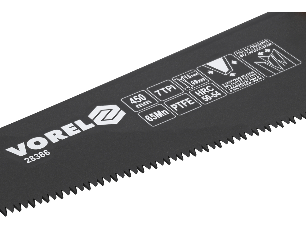 Un ferăstrău clasic pentru tăierea lemnului. Lungime ferăstrău 450mm. Lama este realizată din oțel de 65 Mn, acoperită cu un strat din PTFE care reduce frecarea și grăbește tăierea. Dintii ascuțiti în trei planuri garantează o tăietură agresivă în ambele direcții. Mâner ergonomic din ABS și TPR. Duritatea părții de lucru 50 - 54 HRC. Pas dinti 7 tpi.