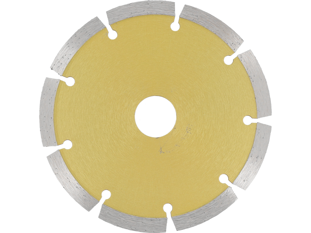 Disc diamantat pentru polizor unghiular, echipat cu segmente înalte de 7mm. Proiectat pentru funcționarea „uscată”. Recomandat pentru tăierea betonului, pietrei, cărămizilor și a altor materiale de construcție. Viteza maxima recomandată aproximativ 11000/min