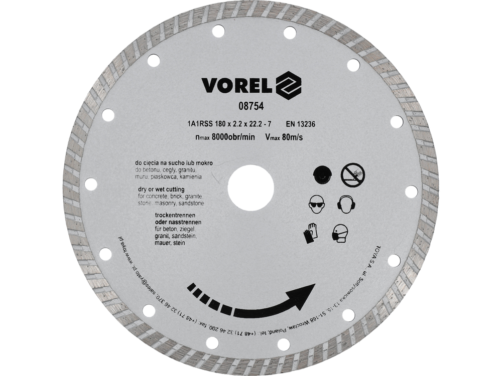 - 08754 - DISC DIAMANTAT TURBO 180MM - Vorel - Disc diamantat pentru polizor unghiular echipat cu un segment turbo continu de 7 mm înălțime. Proiectat