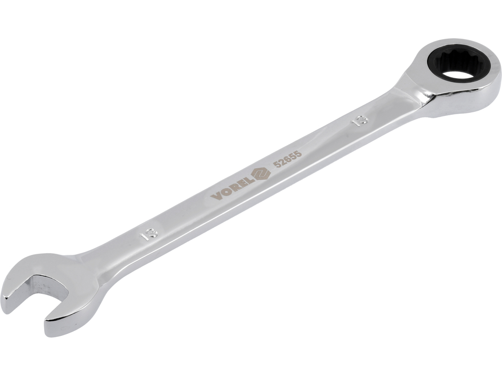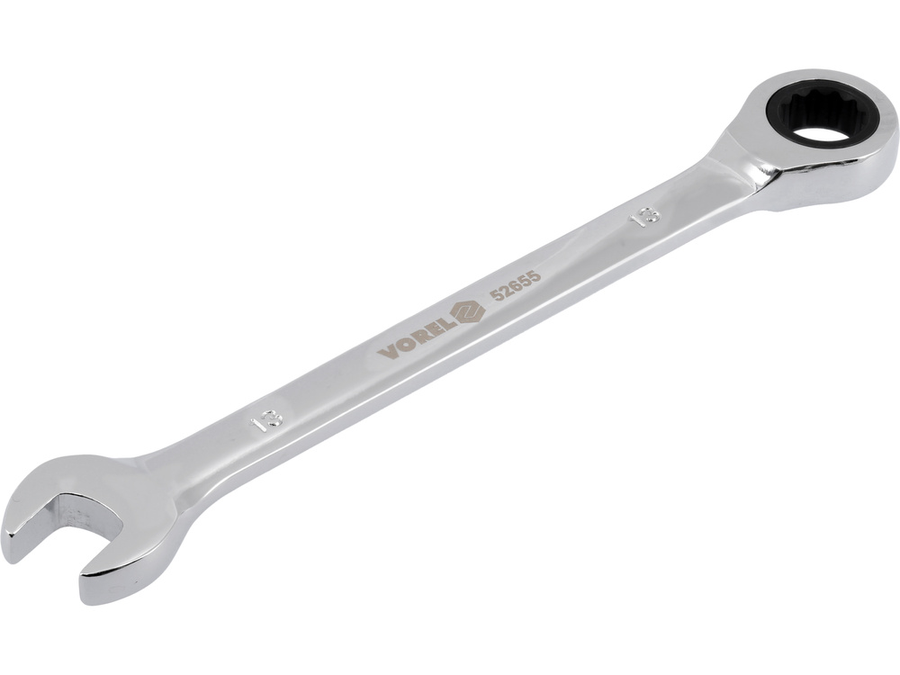 Cheie combinată cu clichet 13 mm Vorel 52655, confecționată din oțel crom vanadiu crV. Clichetul are 72 de dinți. Suprafata finisata cromata.