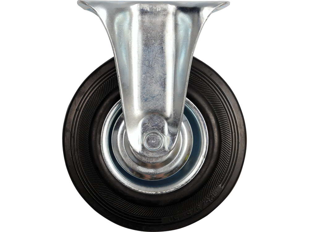 Roată fixă, 125 mm diametru, rulment cu bile, anvelopă din cauciuc negru, 155 mm înălțime.