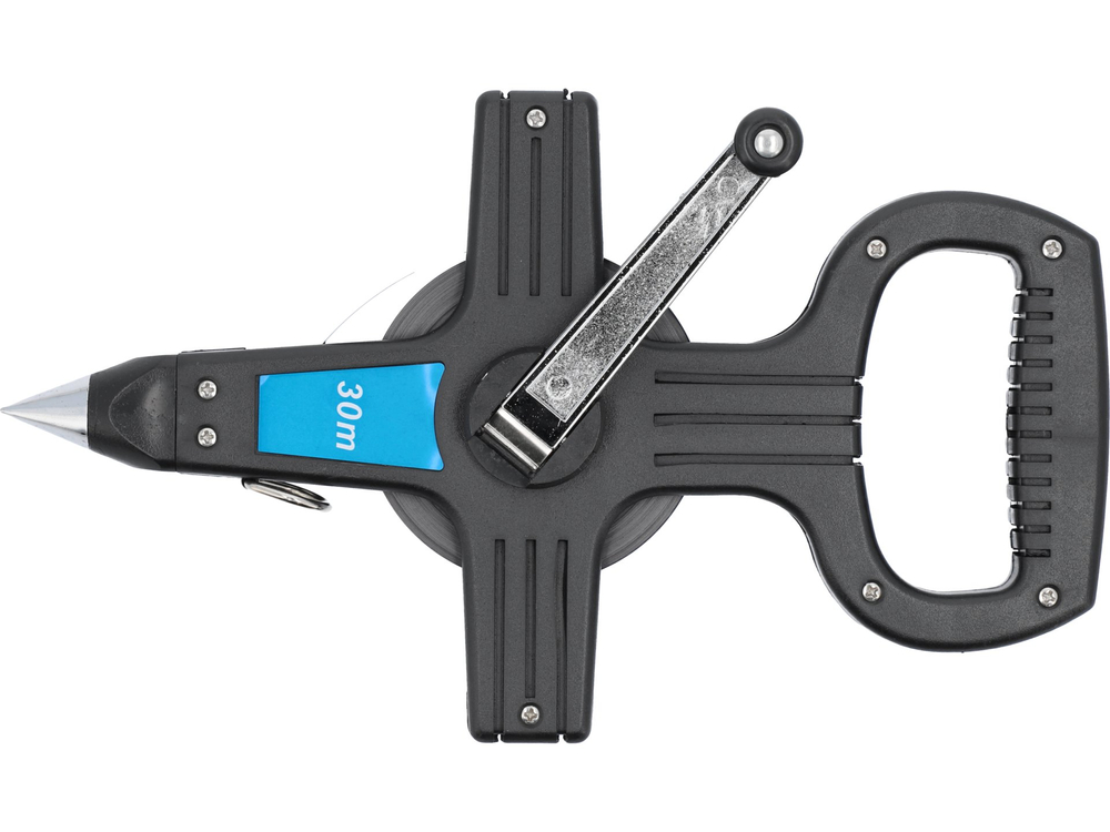 Bandă pt masurare de 30 m lungime și 10 mm lățime. Culoarea benzii alb. Carcasă deschisă din plastic, prevazuta cu manivelă și varf ascuțit pentru a fi infipta in pământ. Carcasa deschisă permite curățarea benzii, previne acumularea de murdărie și deteriorarea benzii.