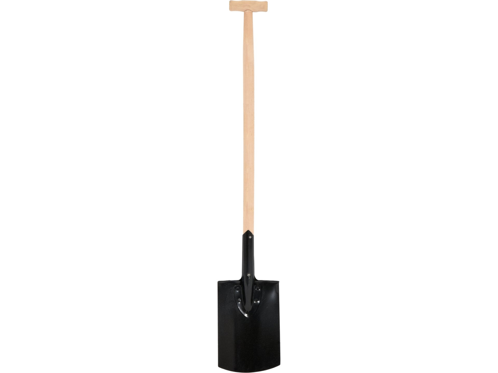 Cazma din oțel protejata împotriva coroziunii de un strat de lac negru. Montata pe o coada din lemn cu mâner în T.