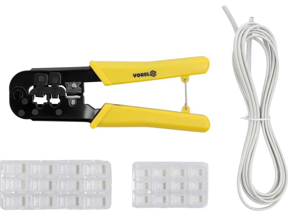 Cleste pentru sertizarea profesională a mufelor de telefonie si internet. Un mecanism eficient facilitează presiunea puternică. Setul include mufe de șase și opt puncte și un cablu pentru testare.