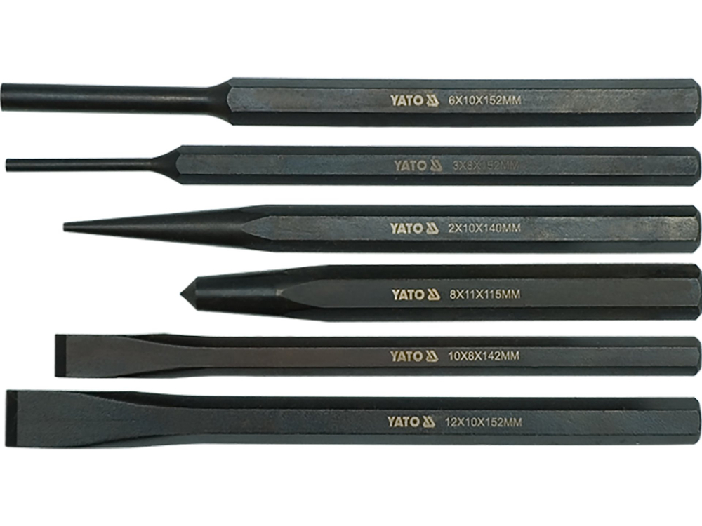 - YT-4712 - SET DALȚI 2X140 3X152 6X152 8X115 CR-V - Yato - Set de dalti punctatoare si dornuri. Setul contine: dalti plate: 10x8x142 mm și 13x10x1