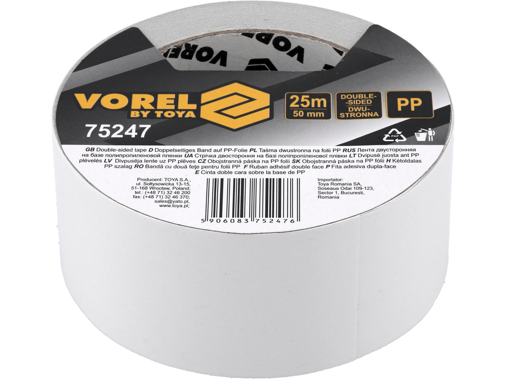 75247 - BANDĂ DUBLU-ADEZIV 50MMX25M - bandă dublu adezivă 50 mm x 25 m Vorel 75247