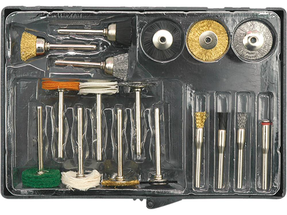 perie de sârmă x8, perie de nailon x4, dorn de sârmă, dorn de lustruit pâslă x3, dorn pentru montarea discurilor cu perii