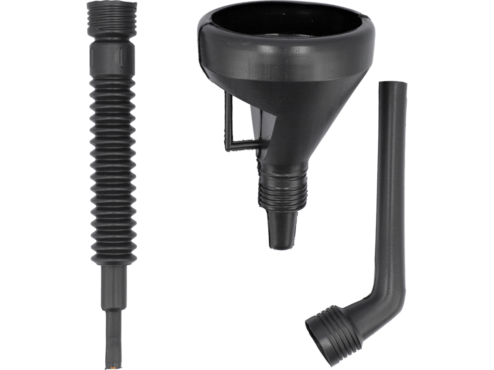 Pâlnie pentru combustibil, ulei și alte lichide de funcționare. Echipat cu 2 vârfuri înlocuibile (unul flexibil și celălalt rigid, aplecat la un unghi de 50 grade) pentru o turnare ușoară.