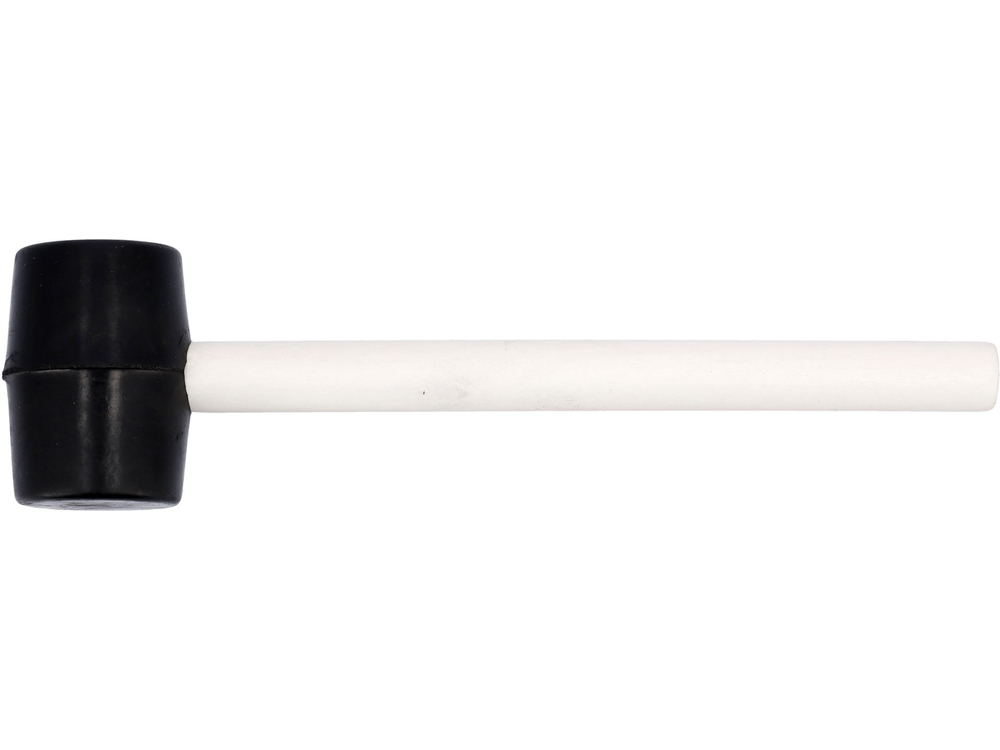 Ciocan fabricat din cauciuc negru dur, cu mâner din lemn lăcuit. Diametrul de aproximativ 45 mm.