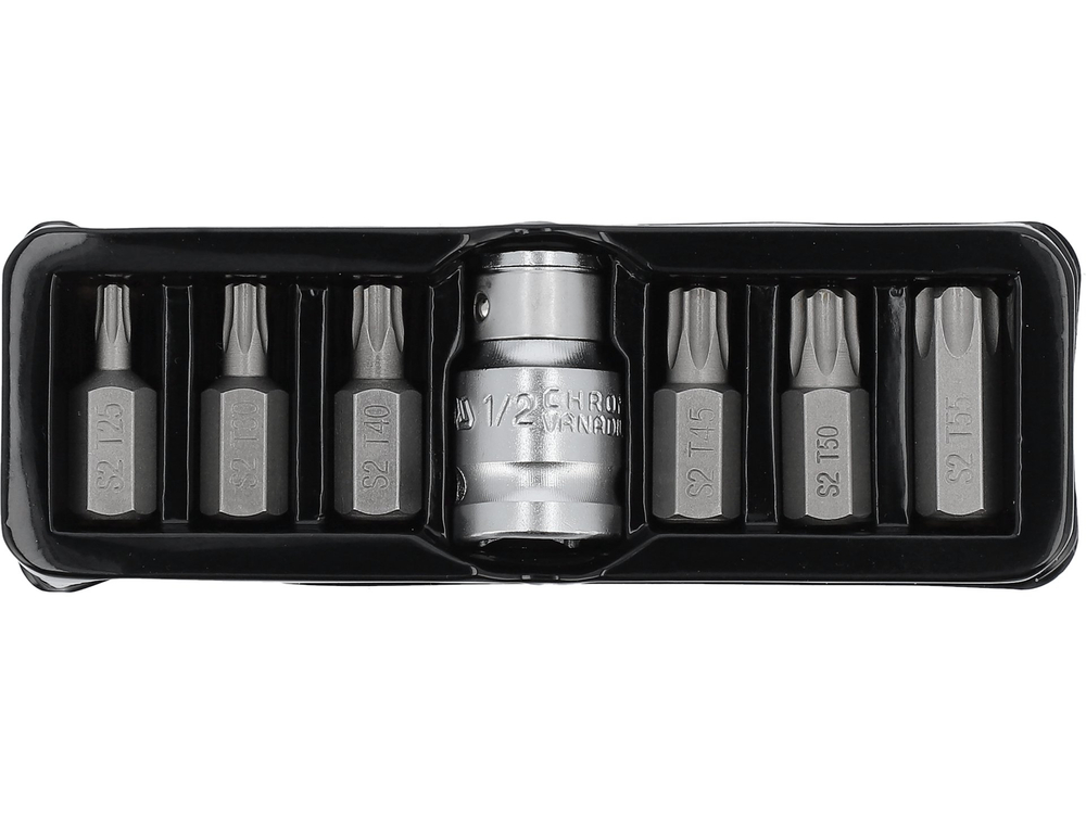 Set biti TORX YATO cu lungimea de 30mm cu suport hexagonal de 10mm realizat din otel S2 de cea mai înaltă calitate, care este caracterizat prin duritate mare HRC 58-62 si o rezistenta pentru un cuplu de strângere ridicat 21,8 Nm. Setul este insotit de un adaptor de 1/2" .