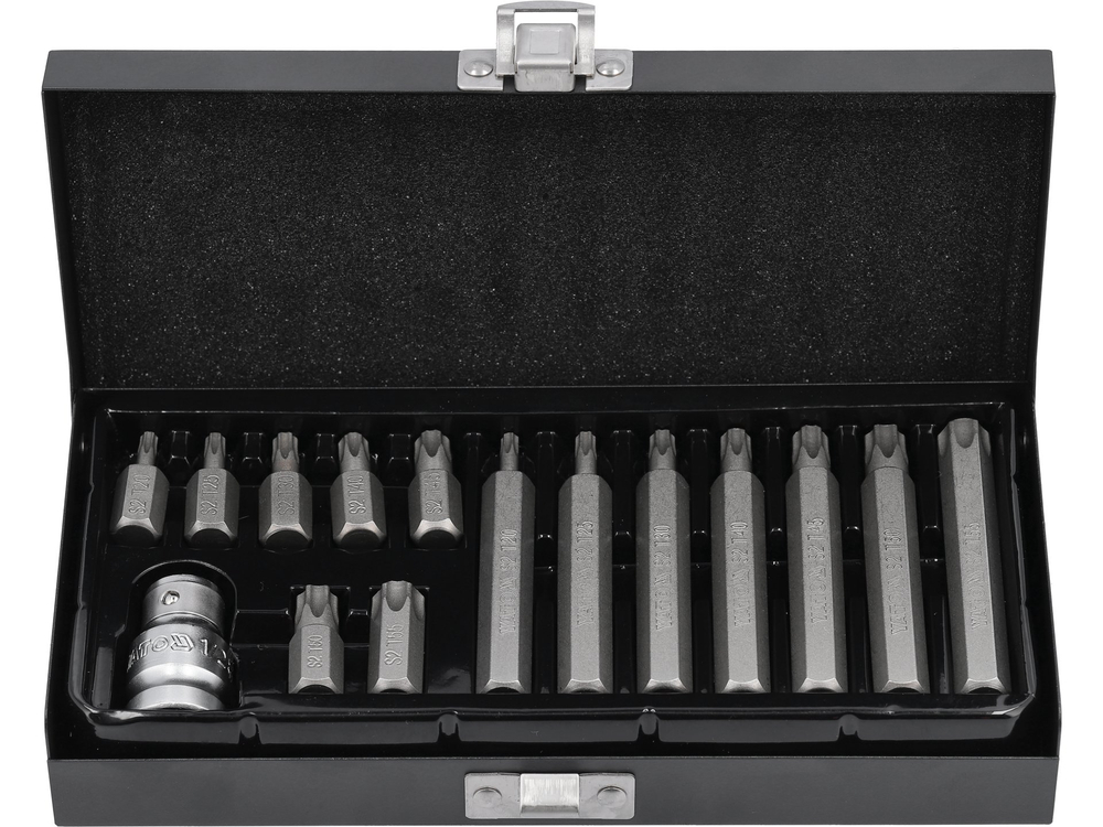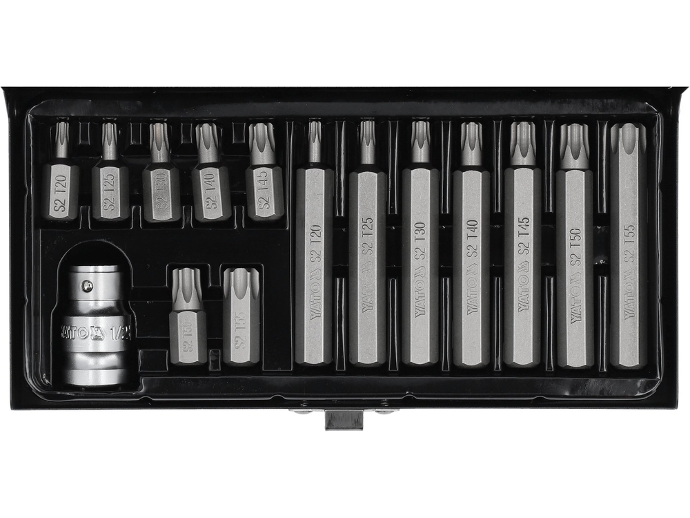 Set biti TORX YATO cu suport hexagonal de 10mm realizat din otel S2 de cea mai înaltă calitate, care este caracterizat prin duritate mare HRC 58-62 si o rezistenta pentru un cuplu de strângere ridicat - 21,8 Nm. Setul este insotit de un adaptor de 1/2" .