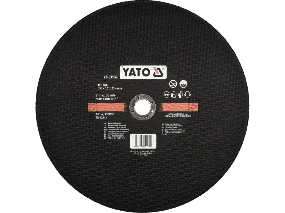 - YT-61132 - DISC DEBITAT METAL 355X25.4X3.2MM - Yato - Disc corindon pentru debitat metal și oțel. Dimensiuni: 355 x 3.2 x 25.4 mm. Compatibil cu fier