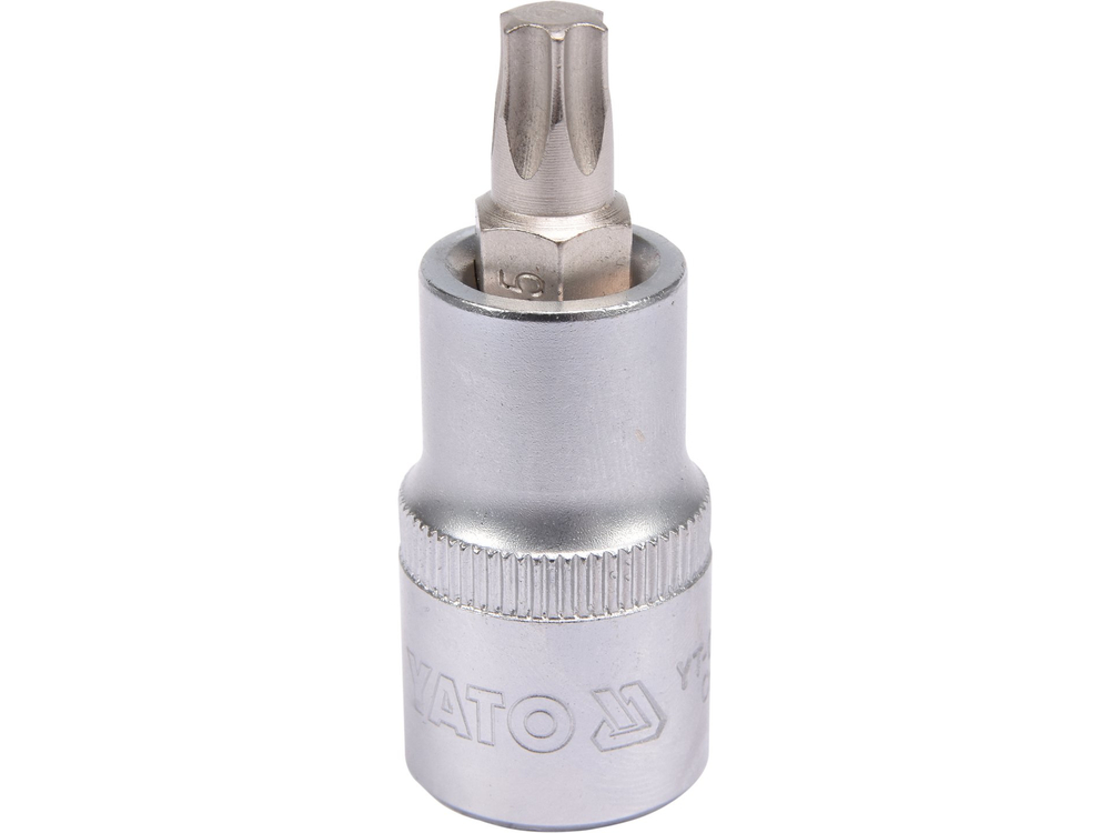Cheie TORX cu adaptor 1/2 ", mărime T45, lungime, 55mm, fabricat din otel CrV6150, iar tija din oțel AISI S2 și acoperit cu un strat de nichel.