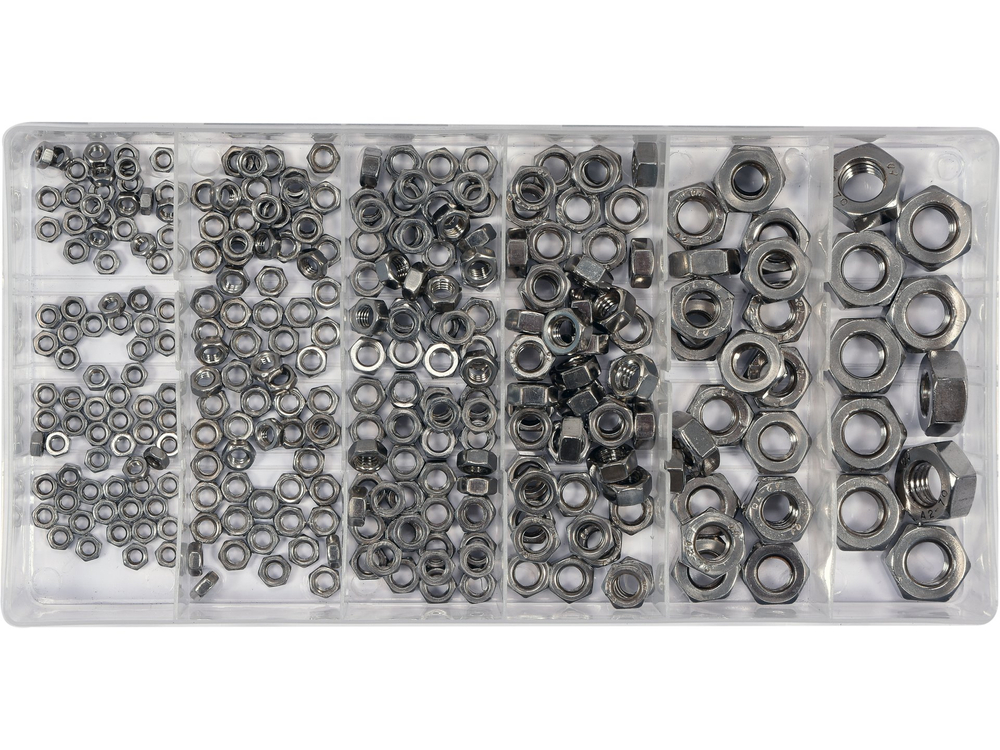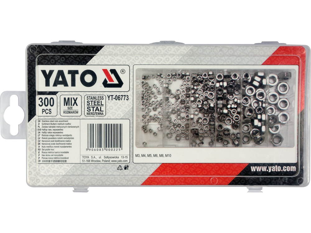 • YT-06773 - SET PIULIȚE INOX 300 BUC - Yato - Un set de 300 de piulițe metrice din otel inoxidabil ce conține dimensiunile M3 M4 M5 M6 M8 M10.