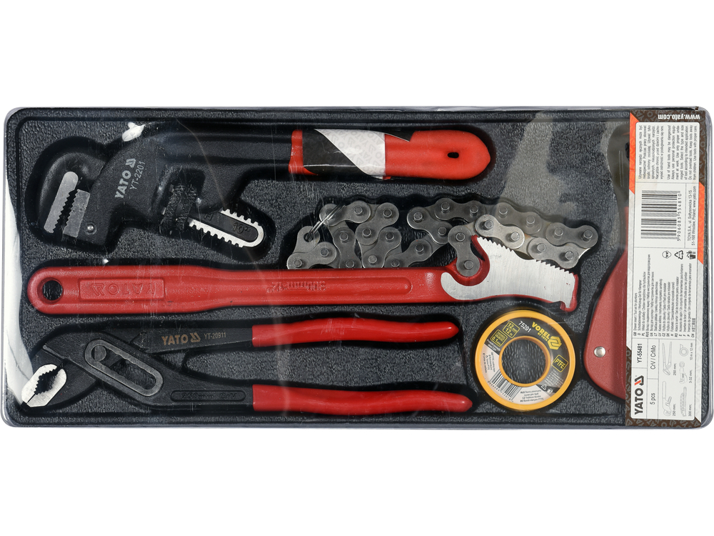 Setul este ambalat într-o tavă de 38,5 x 17,5 x 4,1 cm care se potrivește atât cu cărucioarele, cât și cu cutii de scule YATO YT-09101 / YT-09102 / YT-09107 / YT-09108.