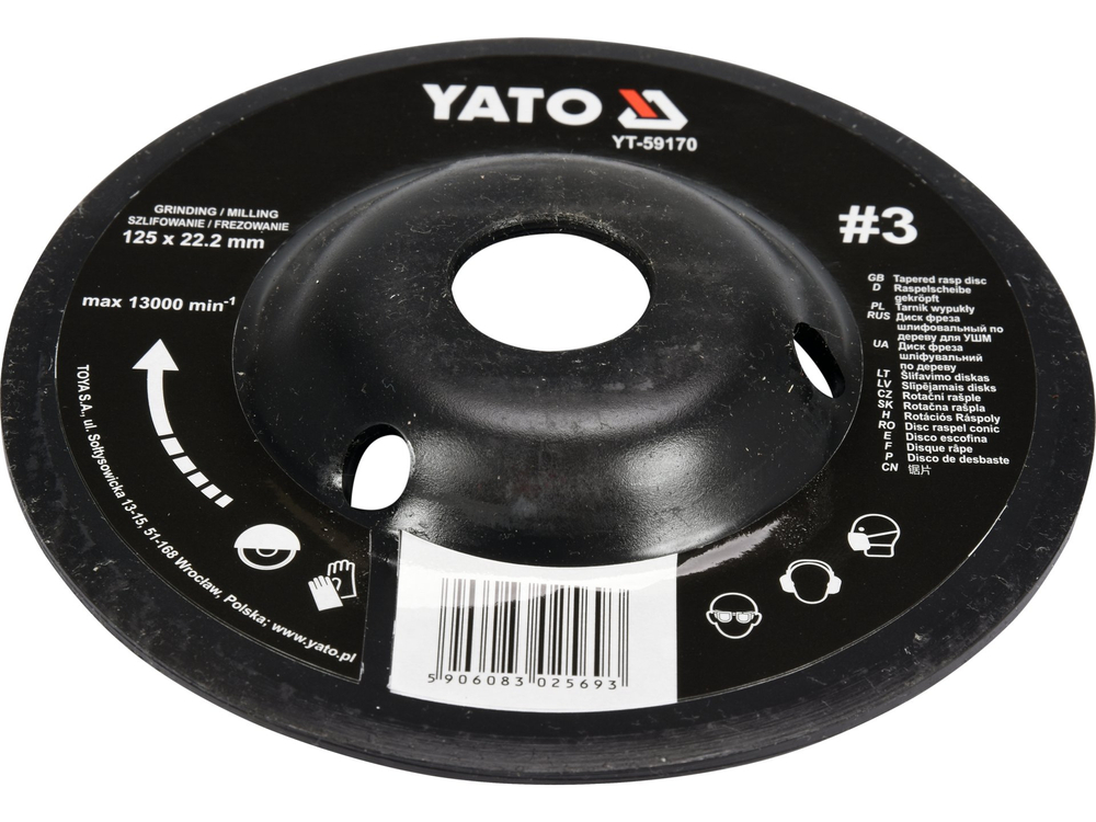 - YT-59170 - DISC RAȘPEL LEMN DEPRESAT 125X22.2MM NR3 - Yato - Diametru 125mm #3 granulatie. Diametrul gaurii de montare: 222mm Viteza maxima de ro