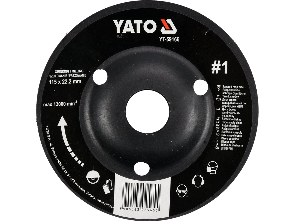 - YT-59166 - DISC RAȘPEL LEMN DEPRESAT 115X22.2MM NR1 - Yato - Diametru 115mm #1 granulatie. Diametrul gaurii de montare: 222mm Viteza maxima de ro