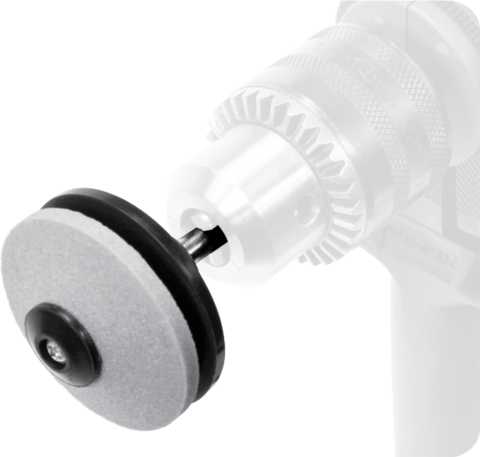 Dispozitiv de ascuțit este proiectat pentru ascuțirea eficientă a cuțitelor, coaselor, lopeților, foarfecelor de grădinărit și alte unelte de tăiere. Se montează ușor în mandrina autofiletantei sau a mini polizorului. Discul abraziv profilat din corund de crom este montat pe o tija de oțel diametrul de 6 mm. Rotatii maxime aprox. 4500 / min