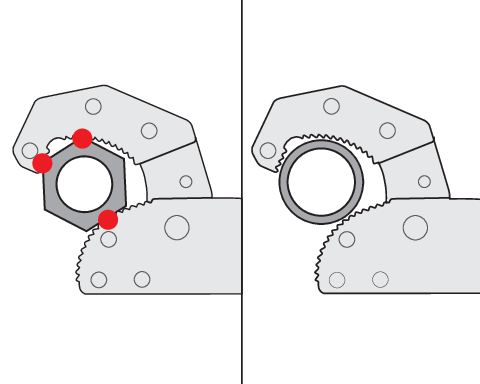 De asemenea, au dinți întăriți cu o duritate de aproximativ 46 ~ 52 HRC. Forma lor special profilata face ca, pe masura ce presiunea asupra cheii creste, acesteia se infig tot mai mult in material, crescand tractiunea si prevenind alunecarea.