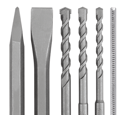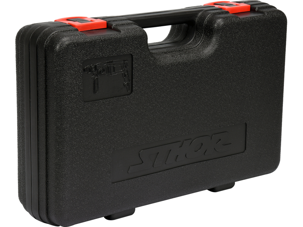 rotopercutor, mâner suplimentar, opritor de adâncime, mandrină, x3 burghie, daltă, șpiț