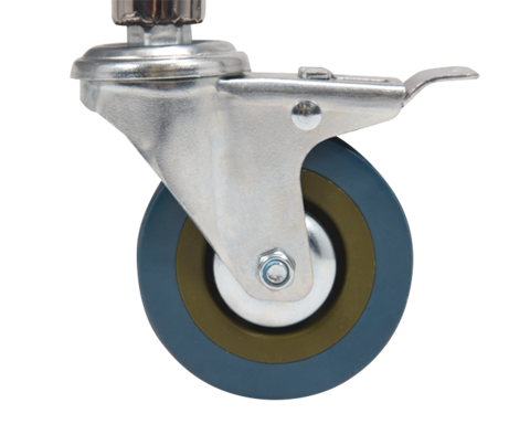 Căruciorul este echipat cu 4 roți cu rulmenți , din TPR gri de înaltă calitate. Utilizarea materialului dur, dar flexibil asigură o funcționare foarte liniștită. Roțile nu zgârie podeaua , nu lasă urme pe ea și sunt pivotante la 360 ° . Acest lucru face posibilă manevrarea în camere greu accesibile și coridoare înguste. În plus, două roți sunt echipate cu frâne.