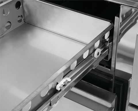 Model cu 4 sertare cu închidere automată cu mânere convenabile pentru deschidere. Permite stocarea containerelor GN 1/1 și a sticlelor cu o înălțime de până la 150 mm.