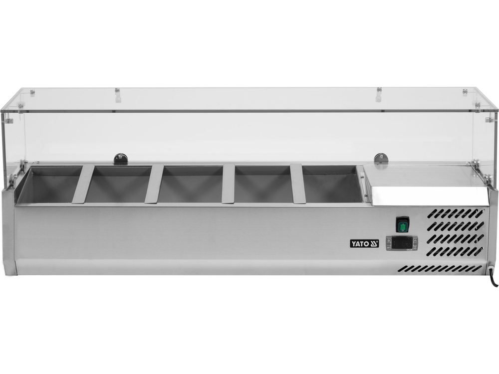 Vitrina frigorifică YATO cu dimensiunile 1200x335x435mm conține 5 recipiente GN 1/4 cu o adâncime maximă de 150 mm.