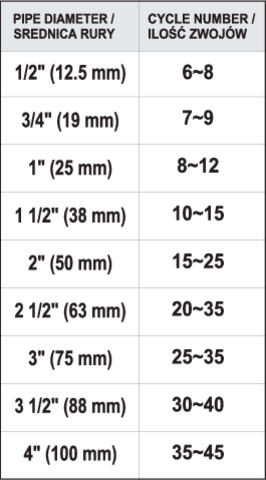 Tabelul anexat arată numărul de rotații sugerate pentru diametrele individuale ale țevilor.