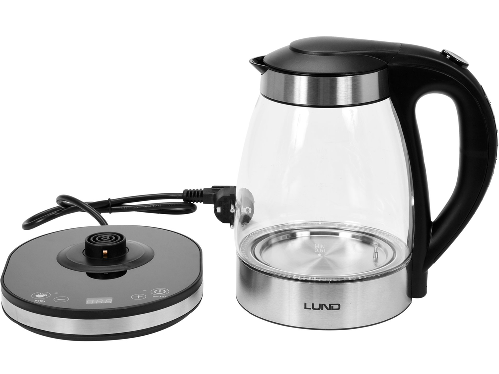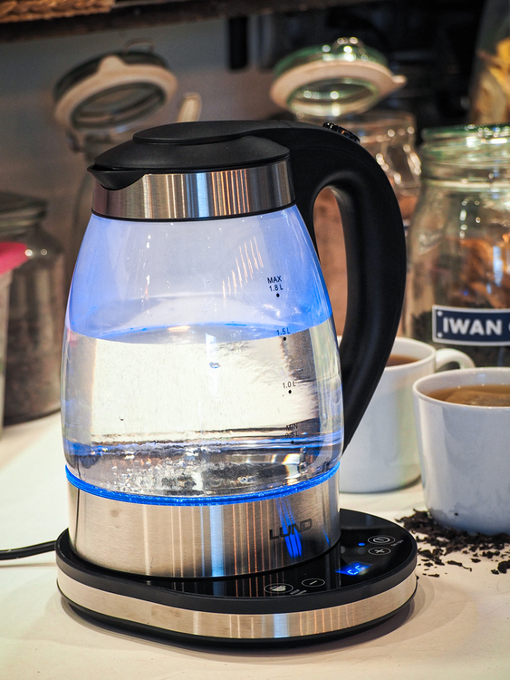Fierbator din sticlă funcție de reglare a temperaturii și un inel cu LED intern care se aprinde albastru atunci când apa fierbe.