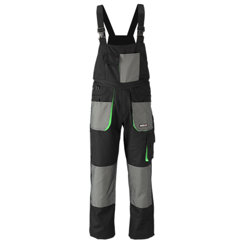 Pantaloni de lucru cu bretele si pieptar YT-80172, cu zece buzunare, dintre care7 cu închidere cu velcro și buzunare speciale pentru genunchiere. Țesătura principală este confecționată din bumbac. Bumbacul păstrează bine căldura și oferă o rezistență de bază la rupere. Cusăturile triple sunt utilizate pentru a conecta materialul în zonele cele mai expuse la rupere: