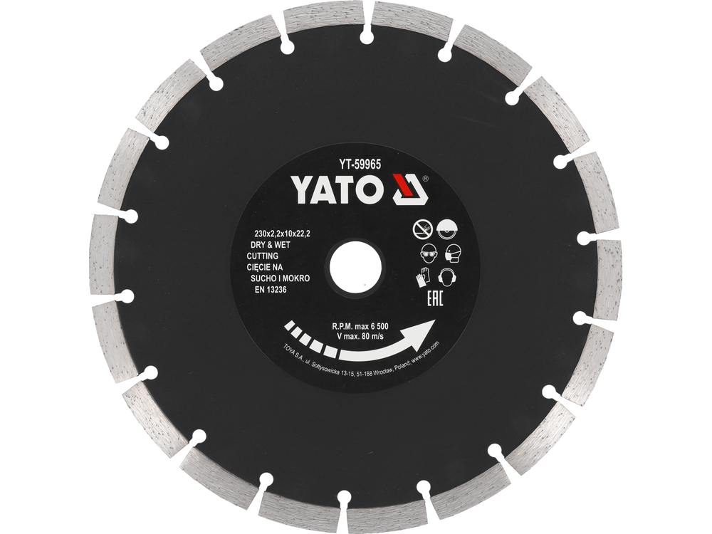 - YT-59965 - DISC DIAMANTAT SEGMENTAT 230X22.2X2.2MM - Yato - Conceput pentru tăiere precisă și curată. Segmentul înalt de 10 mm crește durata de viaț