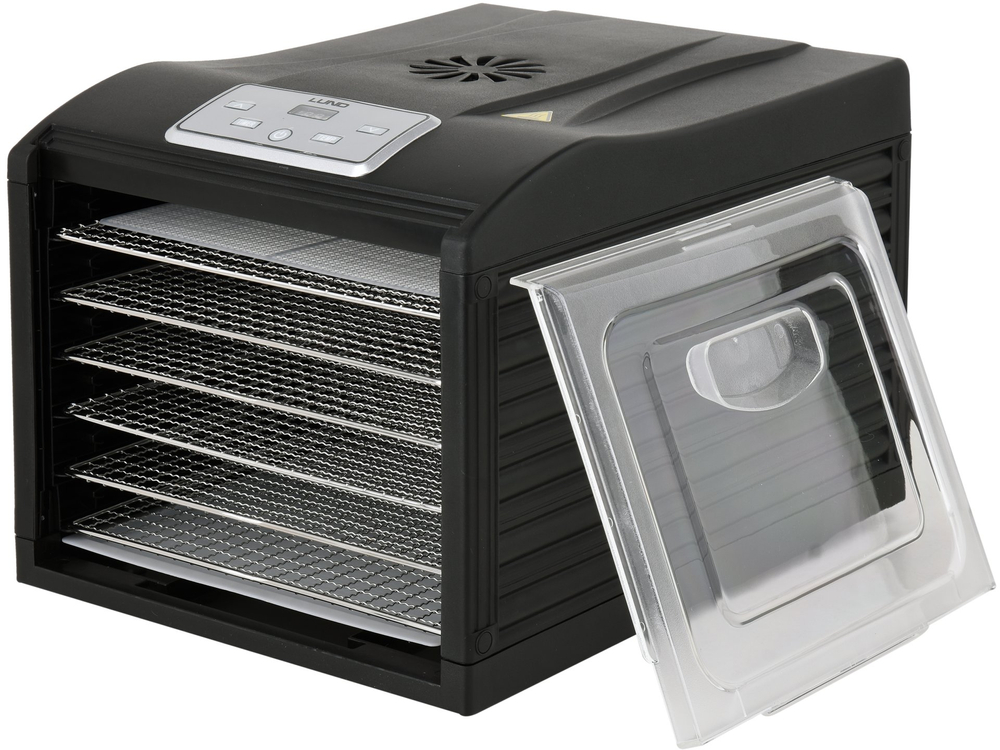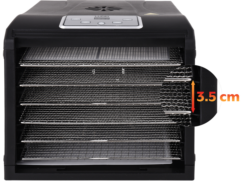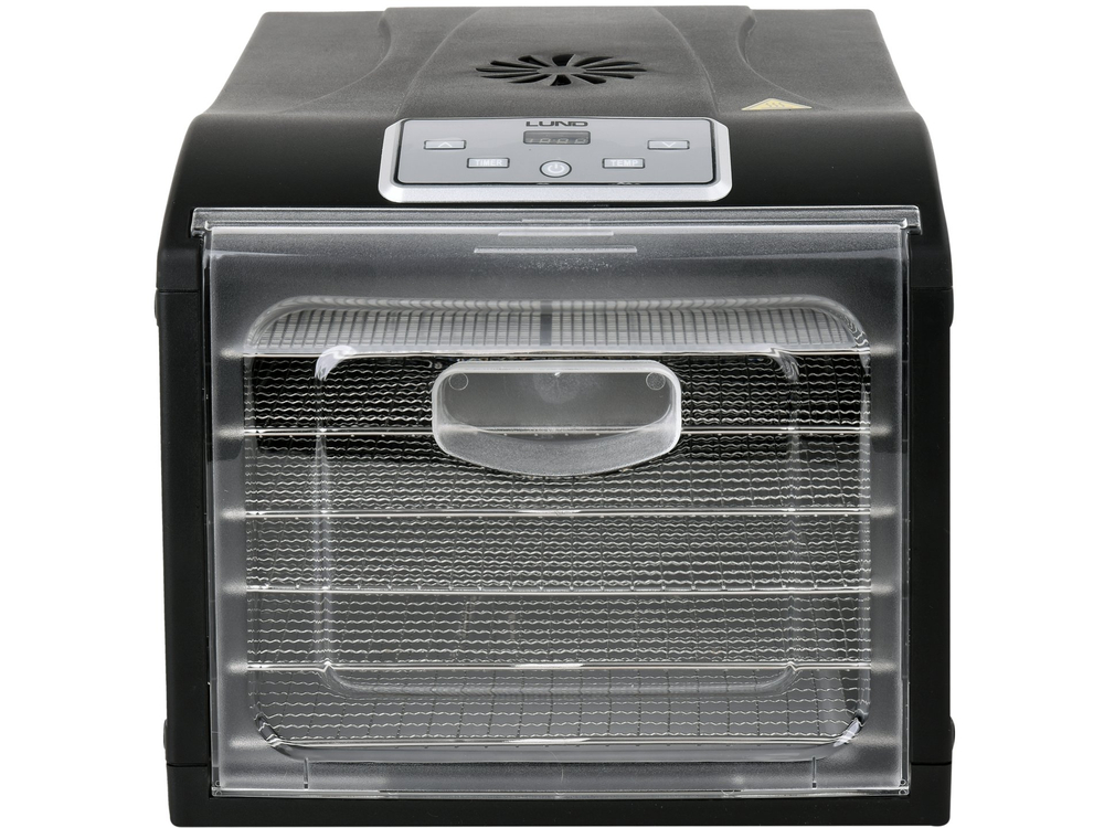 Aparat deshidratare electric LUND este conceput pentru uscarea produselor alimentare: fructe, legume, ciuperci, flori, ierburi, carne și pește. Vă permite să mențineți valoarea nutrițională și gustul alimentelor, conservându-le pentru o perioadă de câteva luni. Datorită temporizatorului încorporat, este posibilă programarea uscării între 0,5 și 19,5 ore. Un avantaj suplimentar îl reprezintă accesoriile: o plasă și o tavă pentru uscarea produselor mici, de exemplu ierburi și ceai.