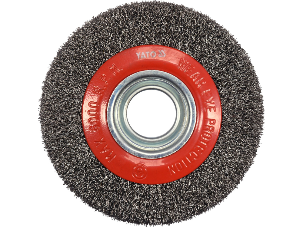 Perie rotativă concepută pentru curățarea și lustruirea suprafețelor metalice, acoperiri de vopsea, precum și pentru îndepărtarea ruginii și instrumente de curățare, folosind o polizor de banc.