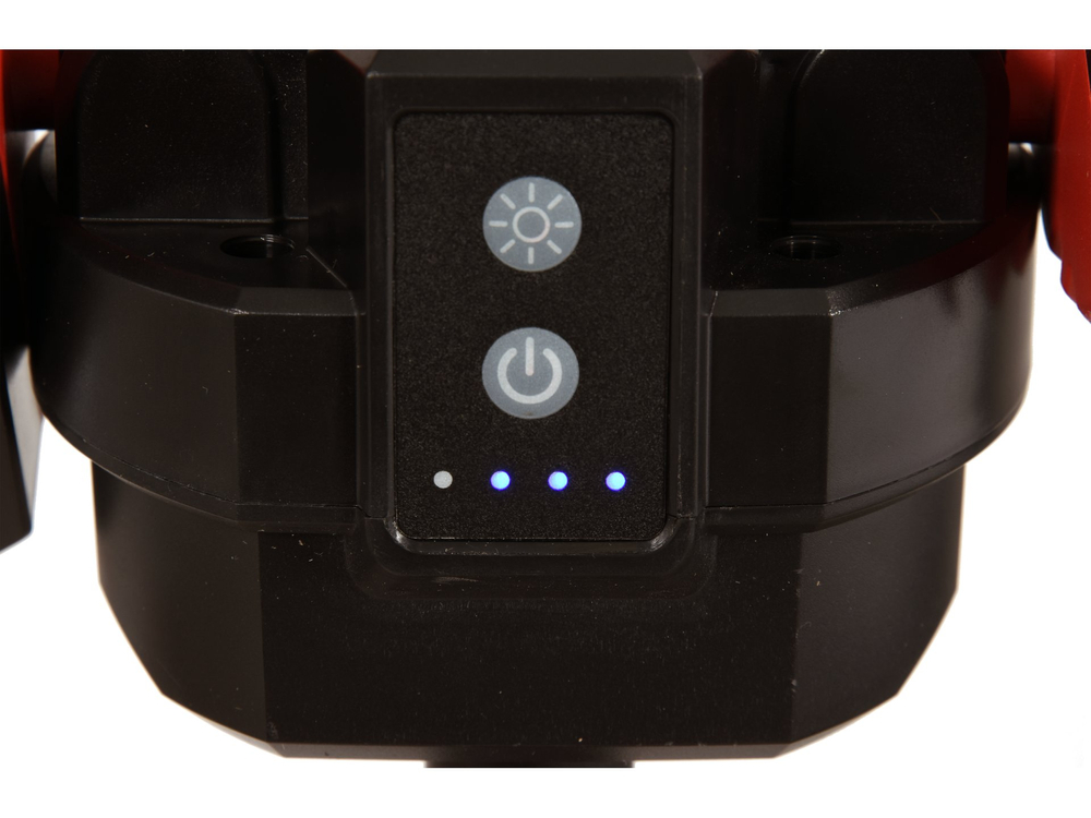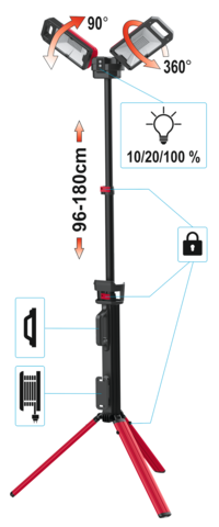 Reflector pliabil, care poate fi alimentat la rețeaua electrică sau de acumulator, cu o putere maximă de 5000 lm. Trei moduri de funcționare și două temperaturi de culoare vă permit să ajustați iluminarea la activitățile efectuate și la nivelul de încărcare al acumulatorului. Acumulatorul puternic de 7.2 V 4000 mAh asigură funcționarea continuă între 1 și 5 ore. Un avantaj suplimentar este reglarea unghiurilor de iluminare și a înălțimii trepiedului.