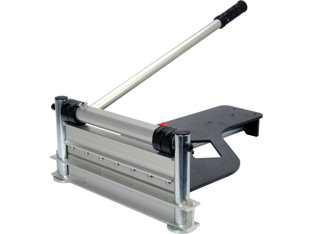 Ghilotina pentru tăierea panourilor de parchet, lățimea de taiere 340 mm, grosimea max. a materialului tăiat este de 16 mm. Cuțitul ghilotinei este montat în profile de aluminiu, montate pe socluri verticale din oțel. Bratul de presare are aproximativ 600 mm lungime, blatul este din material dur, rezistent la uzura si măsoara 370 mm x 600 mm. Cuțitul ghilotinei este extrem de ascuțit și trebuie să aveți grijă când lucrați cu el. Ghilotină pentru tăierea panourilor de podea și a altor materiale de finisare similare până la cca 16 mm grosime. Așezați piesa de prelucrat pe blatul dispozitivului, între piedestalele de montare a cuțitului, apoi apăsând ușor maneta, coborâți lama pe material și, apăsând în jos, tăiați fragmentul dorit.