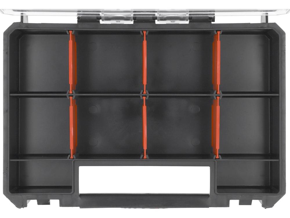 În interiorul cutiei se află 5 organizatoare destinate depozitării accesoriilor mici de lucru.