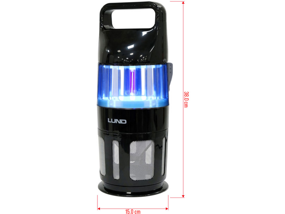 Lampă UVA cu ventilator, folosită pentru a atrage și prinde insecte zburătoare, cum ar fi țânțari, muște, viespi, molii și multe altele. Dispozitivul folosește becuri puternice cu lungimi de undă de 365 nm și acoperă până la 60 m2. După ce insectele sunt aspirate de ventilator, acestea sunt depozitate într-un recipient cu pâlnie, care blochează orice șansă de scăpare. Un avantaj suplimentar este mânerul de transport și un cablu de alimentare cu o lungime de 1,9 m