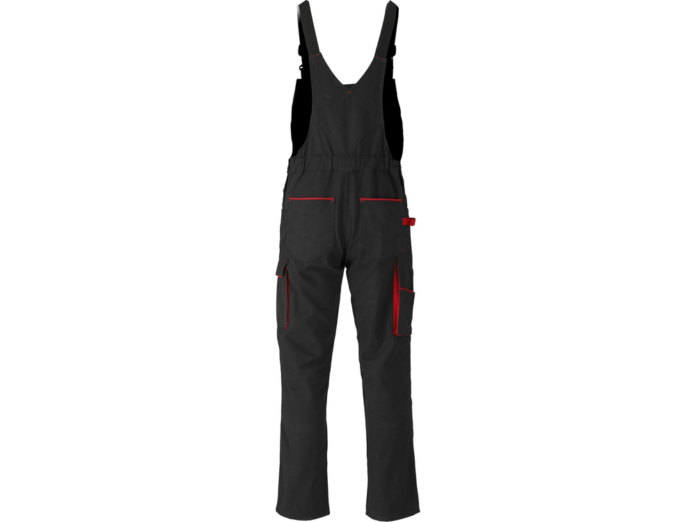 Nouă buzunare, inclusiv un buzunar mare în zona pieptului cu închidere cu fermoar și o buclă pentru ciocan, vă vor ajuta să vă organizați munca. Bureții materiali cu reglare și banda elastică din spate. Pe laturi, nasturi cu reglare a lățimii în talie, iar în spate este cusută o bandă elastică. La genunchi, buzunare pentru protecții genunchi cu închidere cu arici. Pantalonii sunt de culoare închisă cu linii roșii, care pe lângă funcția decorativă întăresc și protejează marginile buzunarelor deschise împotriva ruperii.