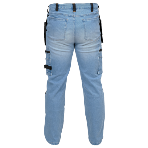 Pantaloni de lucru monterski din seria stretch jeans sunt fabricați dintr-un denim uzat și elastic, cu adaos de elastan. Aceștia au nu mai puțin de 17 buzunare, inclusiv 1 cu închidere cu arici, 2 cu închidere cu fermoar și 2 buzunare monterski detasabile dintr-un material rezistent, care ajută la organizarea muncii pentru tâmplar, dulgher sau instalator.