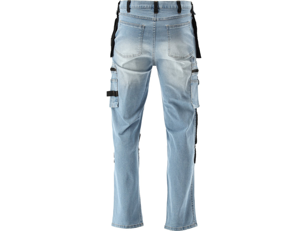 Pantaloni de muncă montani din seria stretch jeans sunt fabricați din denim uzat și elastic cu adaos de elastan. Aceștia au 17 buzunare, inclusiv 1 cu închidere cu scai, 2 cu fermoar și 2 buzunare montane detașabile dintr-un material rezistent, care ajută în organizarea muncii unui tâmplar, acoperișar sau instalator.