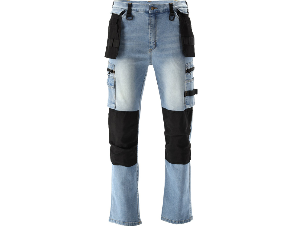 Pantaloni de lucru monterski din seria stretch jeans sunt fabricați dintr-un denim uzat și elastic, cu adaos de elastan. Aceștia au nu mai puțin de 17 buzunare, inclusiv 1 cu închidere cu arici, 2 cu închidere cu fermoar și 2 buzunare monterski detasabile dintr-un material rezistent, care ajută la organizarea muncii pentru tâmplar, dulgher sau instalator.