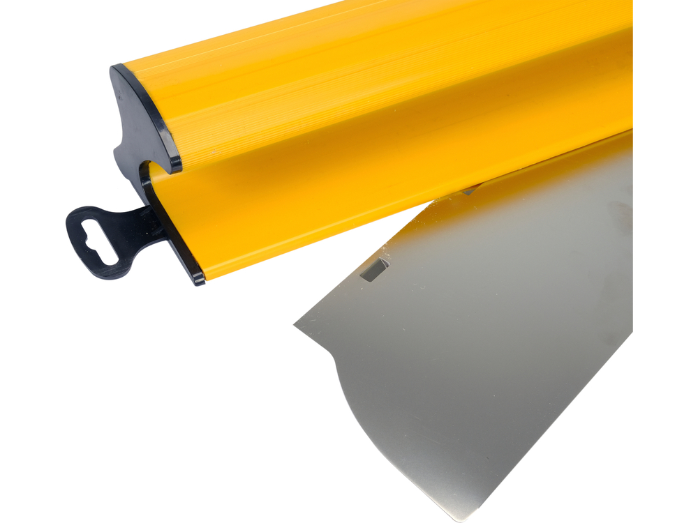 SPATULA DE TENCUIALA CU MANER DIN MATERIAL PLASTIC PROFILAT INALTIME APROXIMATIV 60 MM DE LA BAZA LAMA DE LUCRU FIXATA DIN OTEL INOXIDABIL GROSIME 0,3 MM, INALTIME 110 MM LUNGIME 800 MM CONSTRUCTIA MANERULUI PERMITE SCHIMBAREA LAMEI. LAMA DE SCHIMB Nr. de inventar 06013