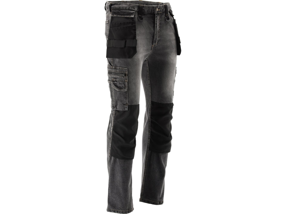 Pantaloni de lucru jeans gri cu elastan. Până la șaptesprezece buzunare, inclusiv unul cu închidere velcro, două cu fermoar și două buzunare detașabile. Un număr mare de buzunare din material rezistent vor ajuta la organizarea muncii unui tâmplar, montator de acoperișuri sau instalator.