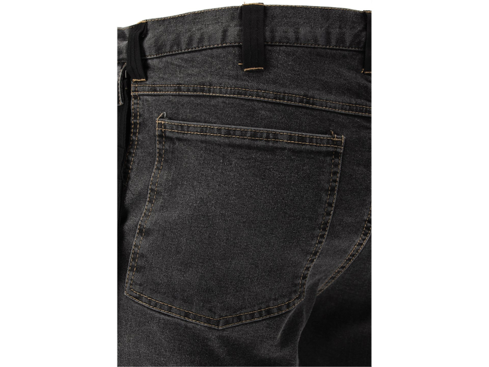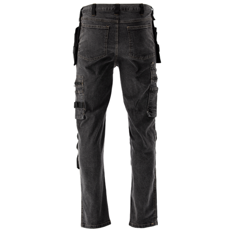 Pantaloni de lucru jeans gri cu elastan. Până la șaptesprezece buzunare, inclusiv unul cu închidere velcro, două cu fermoar și două buzunare detașabile. Un număr mare de buzunare din material rezistent vor ajuta la organizarea muncii unui tâmplar, montator de acoperișuri sau instalator.