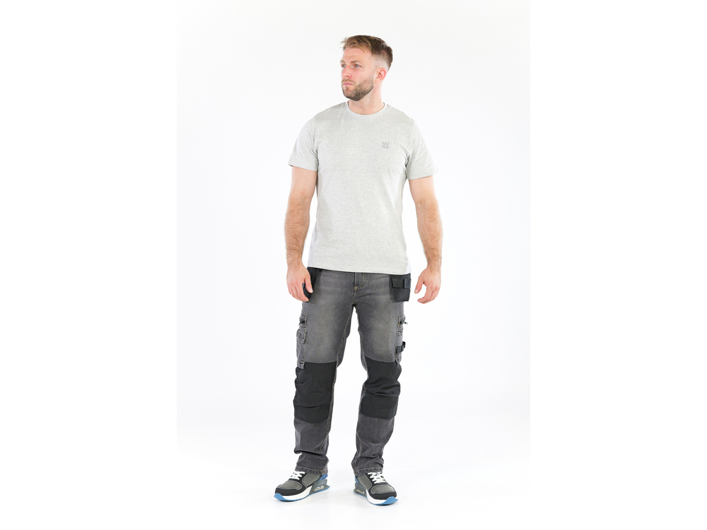 Pantaloni de lucru jeans gri cu elastan. Până la șaptesprezece buzunare, inclusiv unul cu închidere velcro, două cu fermoar și două buzunare detașabile. Un număr mare de buzunare din material rezistent vor ajuta la organizarea muncii unui tâmplar, montator de acoperișuri sau instalator.