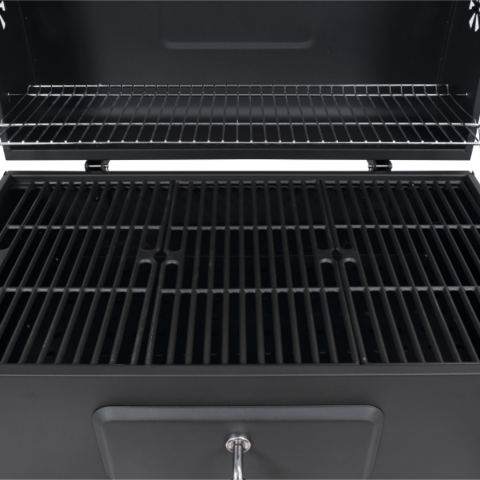 Un grătar cu cărbuni XXL, stabil, cu suprafață de gătit din fontă și un grilaj de încălzire cromat. Datorită reglajului fin a înălțimii tăvii de cărbuni, utilizatorul poate adapta temperatura jarului la felurile de mâncare preparate. Un avantaj suplimentar îl reprezintă deschizătorul de sticle încorporat, rafturile laterale pliabile și o tava de cenușă extractibilă. Grătarul îndeplineste toate standardele de siguranta în vigoare.