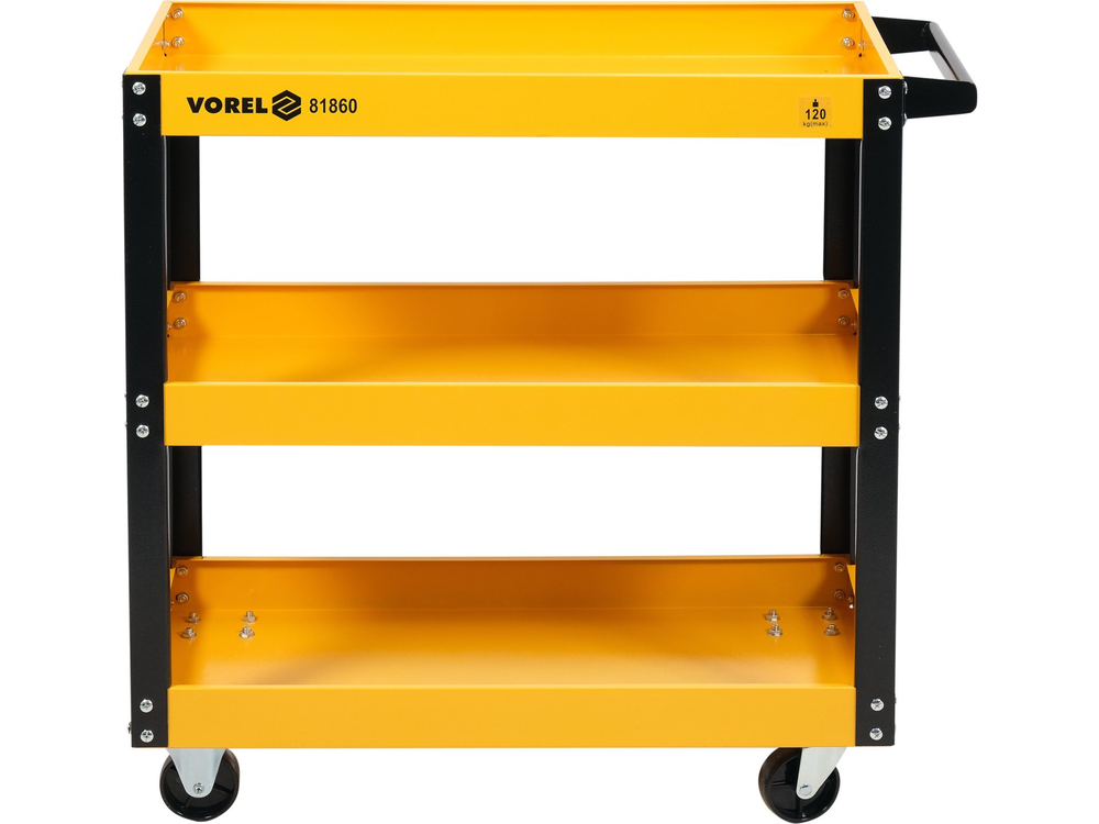 Cărucior pentru atelier practic și rezistent, pe trei niveluri, cu o capacitate de încărcare de 120 kg.