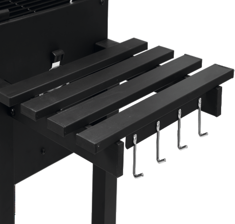 - raftul lateral, metalic, pliabil facilitează prepararea și depozitarea alimentelor. După plierea raftului lateral, grătarul ocupă mai puțin spațiu și este mai ușor de depozitat