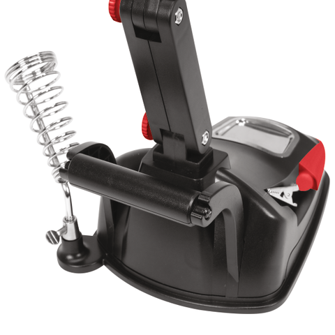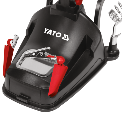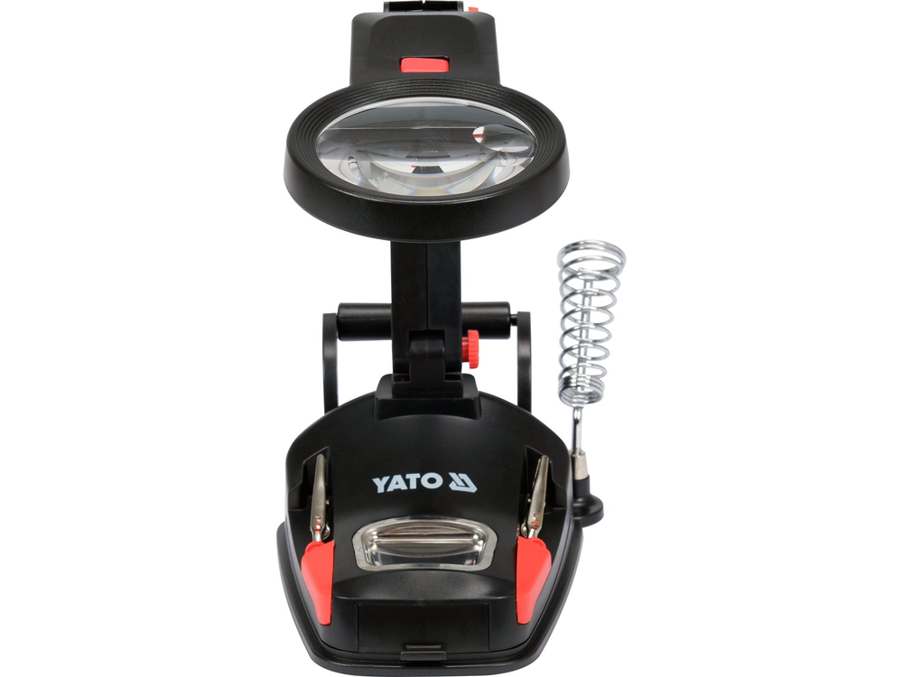 Maner tip "a treia mână" cu iluminare în formă de inel cu 10 LED-uri. Lentilă dublă - cea mai mare cu diametrul de 75 mm oferă o mărire de x 3. Lentilă mai mică - încorporată, cu diametrul de 20 mm mărește imaginea cu x 4,5. Brațul rotativ la 360 de grade cu reglare a unghiului în trei locuri permite lucrul facil atât în zona clipurilor auxiliare, cât și în afara acesteia. Două clești montate pe brațe mobile și pe articulații cu bile duble oferă posibilități largi de ajustare a cleștilor atât pentru bijuterii fine, cât și pentru plăcuțe PCB de dimensiuni mici. Suport pentru burete de lipit, suport pentru bețe de lipit, role pentru montarea materialului de lipit și un compartiment pentru șuruburi de demontare ajută la organizarea muncii.